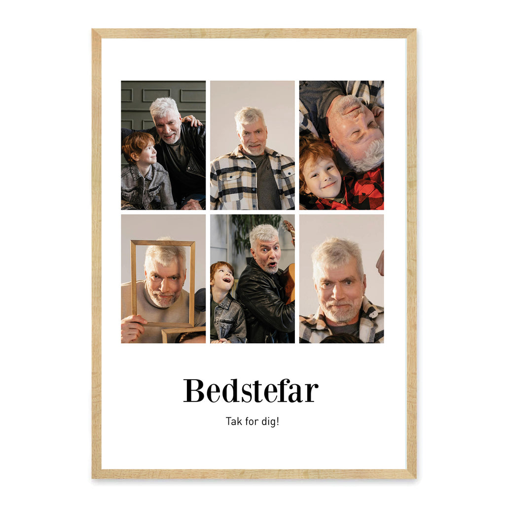 En bedstefar efterlader spor af visdom, tryghed og lune historier, som følger én hele livet. Denne plakat er skabt som en hyldest til alle de stunder, han har gjort særlige – fra de små grin til de store fortællinger, der altid vender tilbage. Den samler jeres nærmeste minder i et udtryk, der viser, hvor meget han betyder. Plakaten kan designes med 6 eller 9 billeder, en personlig titel og tekst, så den afspejler netop jeres relation.