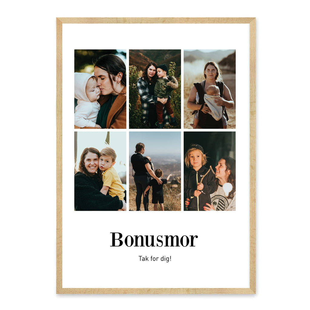 En bonusmor er den, der træder ind i livet med åbenhed, varme og en omsorg, der vokser frem skridt for skridt. Hun skaber tryghed, deler glæderne i hverdagen og bliver en del af familiens historie på sin helt egen måde. Denne plakat er skabt som en hyldest til hende, der både vælger og elsker jer. Plakaten kan designes med 6 eller 9 billeder, en personlig titel og tekst, så den afspejler jeres fælles rejse.