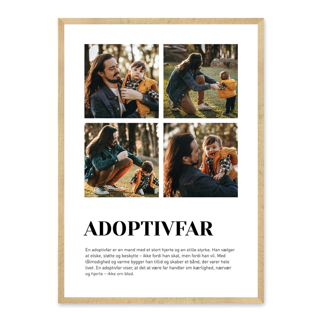 En hyldest til den far, der valgte med hjertet. Denne smukke Adoptivfar-plakat fejrer kærligheden, omsorgen og trygheden i et bånd, der ikke er skabt af blod, men af kærlighed. Gør plakaten helt personlig med dine egne billeder og tekst, så den bliver et minde, der varer hele livet.