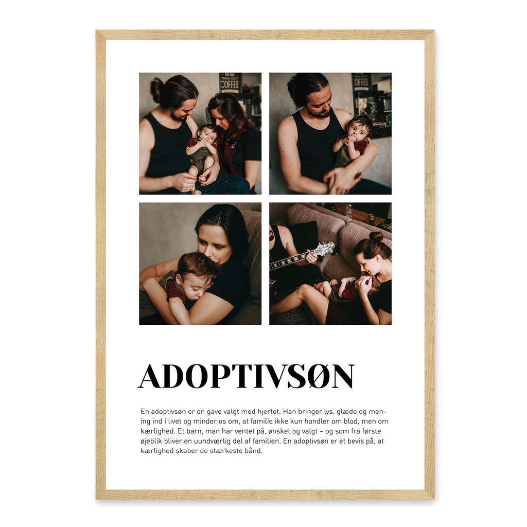 Vælg mellem et design med ét eller fire billeder, og tilføj en færdig tekst fra vores liste – eller skriv din egen. En rørende gaveidé til en adoptivsøn, der fortjener at blive mindet om, hvor elsket og værdsat han er.