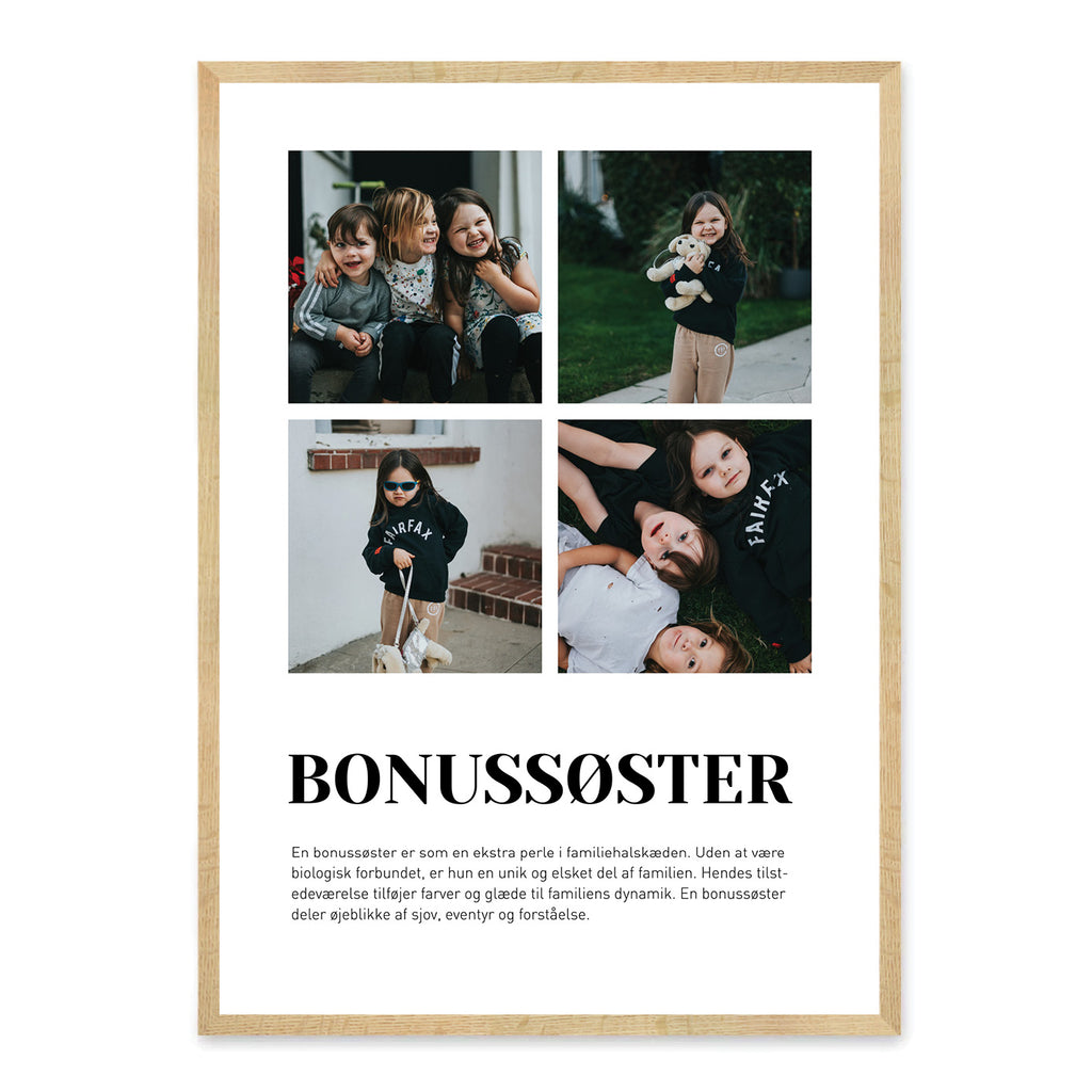 Fejr kærligheden og det særlige bånd til din bonussøster med denne smukke plakat. Gør den personlig med egne billeder og tekst, så den afspejler minder, nærvær og de gode stunder, I deler sammen.