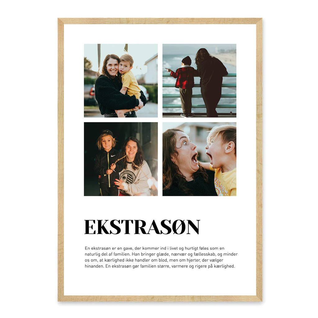 Fejr kærligheden og det særlige bånd til din ekstrasøn med denne smukke plakat. Gør den personlig med egne billeder og tekst, så den afspejler minder, nærvær og de gode stunder, I deler sammen.