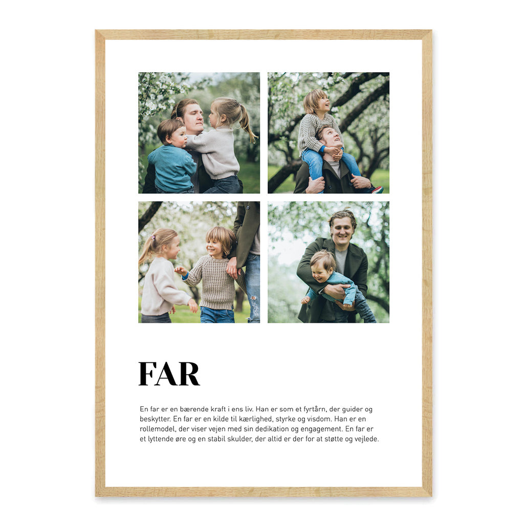 Fars dag falder den samme dato hvert år, nemlig d. 5/6. Plakater kan bruges året rundt, men særligt på Fars dag er de en fantastisk anledning til, at få sagt de ting vi enten ikke får sagt i hverdagen, eller nogle gange kan have svært ved. Fædre giver kærlighed, beskytter og er en af de bedste legekammerater. En far kan fikse ting der er gået i stykker. Fars dag er en helt særlig dag, hvor vi har anledning til, at hylde vores fædre og give noget af den kærlighed tilbage, som vi har modtaget gennem livet. Dette kan du helt sikkert gøre med en far plakat, som vil glæde hver gang han ser på den.