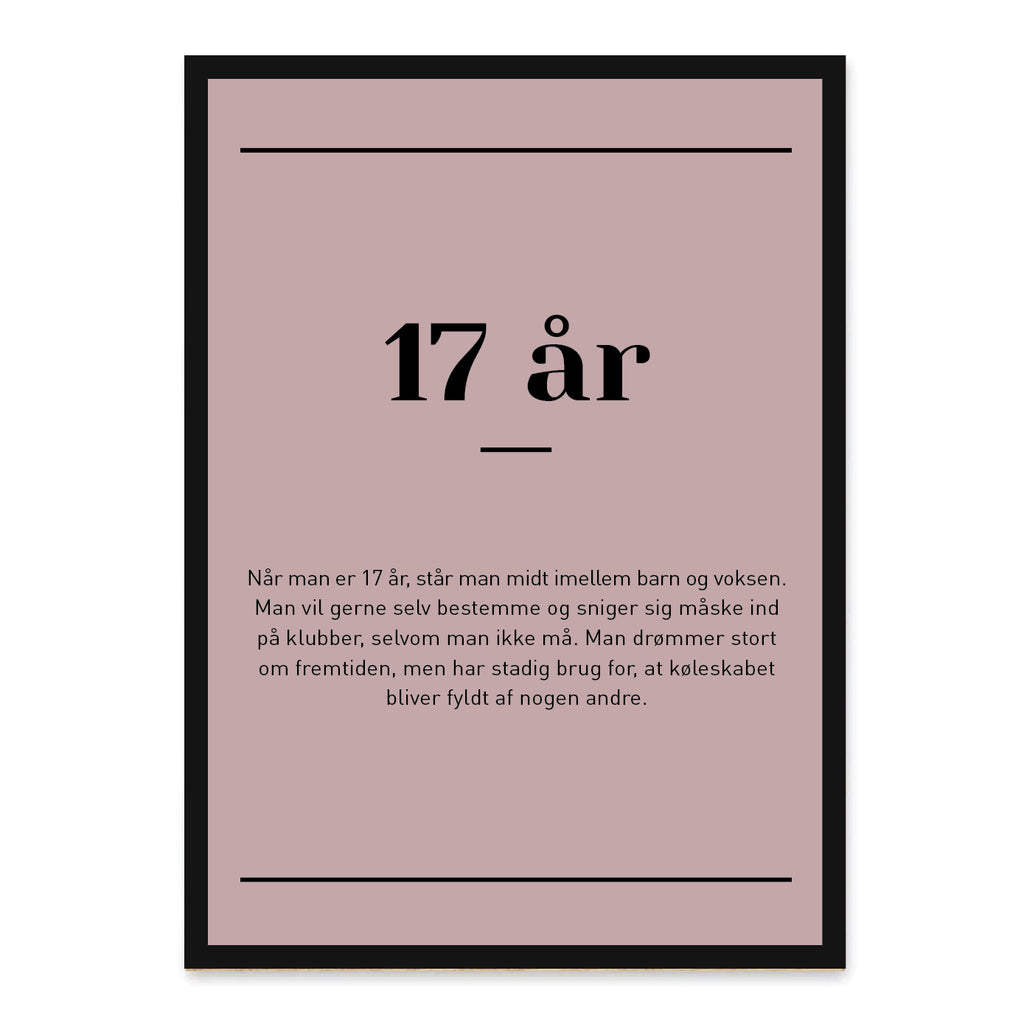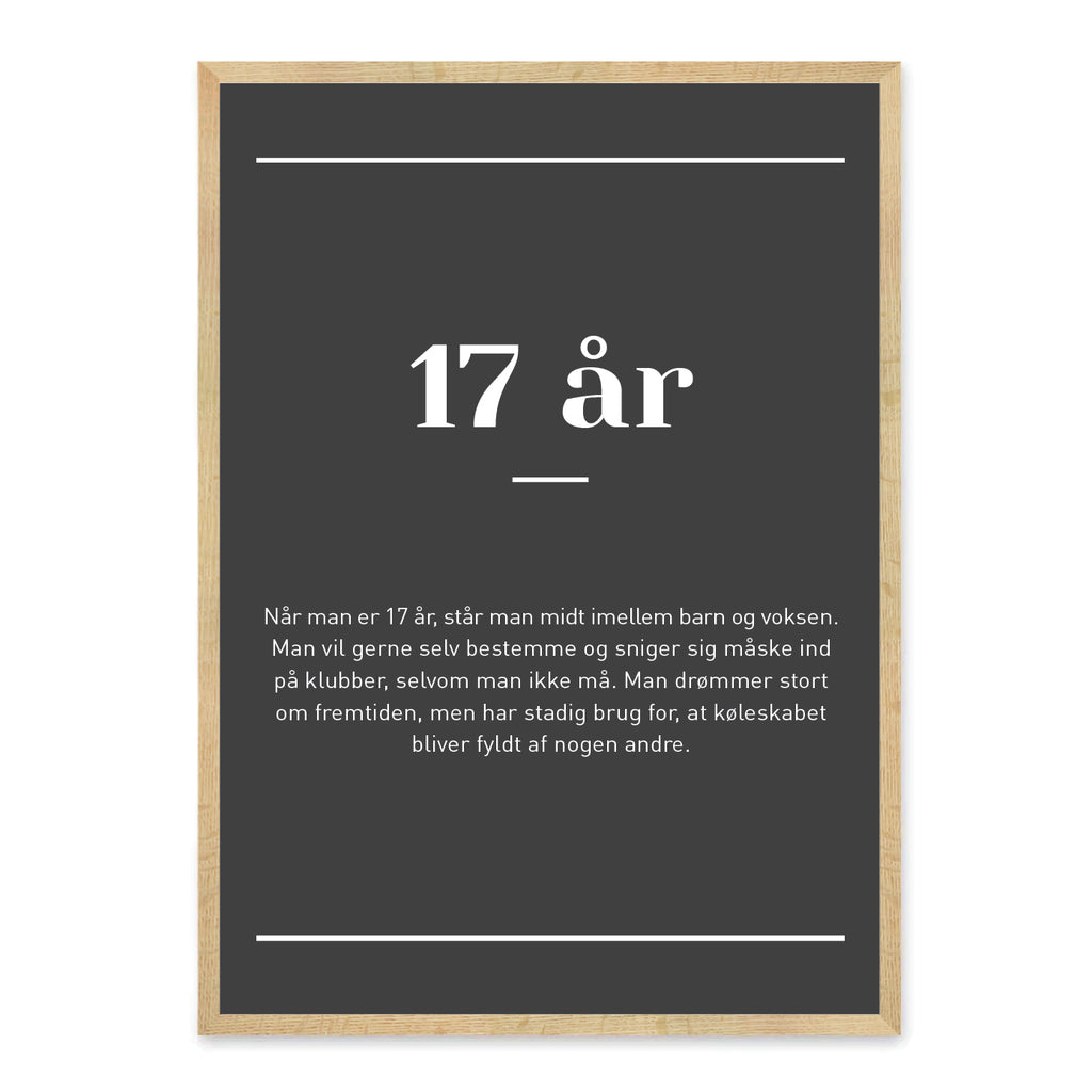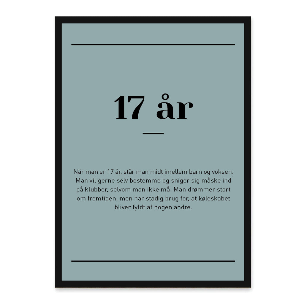 Perfekt som gave til 17-års fødselsdagen eller som personlig dekoration på teenageværelset. Det stilrene og moderne design gør plakaten let at integrere i ethvert hjem – og skaber smil og genkendelse.