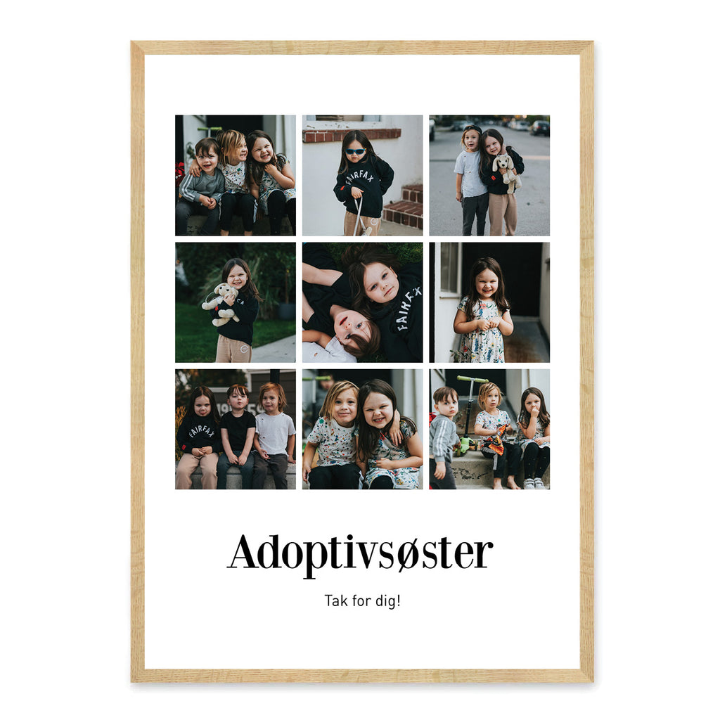 Denne smukke plakat er skabt som en personlig og kærlig gave til en adoptivsøster. Den hylder det særlige søskendebånd, der vokser frem gennem kærlighed, omsorg og fælles minder – uanset hvor i verden livet begyndte. Plakaten kan tilpasses med dine egne 6 eller 9 billeder, en personlig overskrift og tekst, så den fortæller jeres unikke historie.