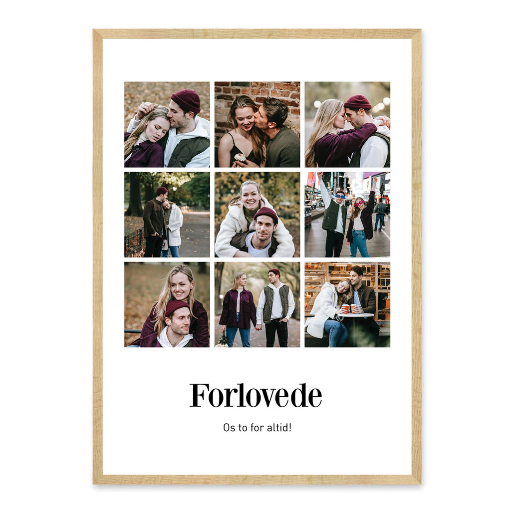 Overrask din forlovede med en personlig plakat, der indfanger jeres kærlighedshistorie – fra de første øjeblikke til alt det, I drømmer om fremover. Plakaten er en kærlig hyldest til den, du har valgt at dele livet med, og et evigt minde om de øjeblikke, der har formet jeres forhold. Du kan tilpasse plakaten med jeres egne 6 eller 9 billeder, en personlig overskrift og tekst, så den bliver helt jeres egen.