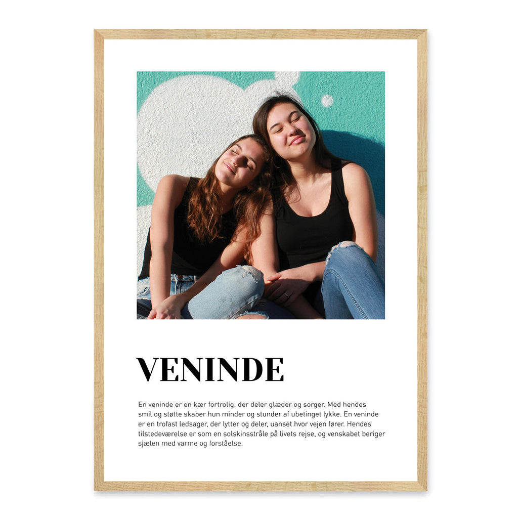 En Veninde-plakat er en kærlig måde at hylde den helt særlige relation, du har til din veninde – uanset om I har været tætte siden barndommen eller først fandt hinanden senere. Den fremhæver de minder, grin og små øjeblikke af nærhed, der binder jer sammen. Plakaten er en smuk måde at vise, hvor meget hun betyder, og hvor stor en rolle hun spiller i dit liv.