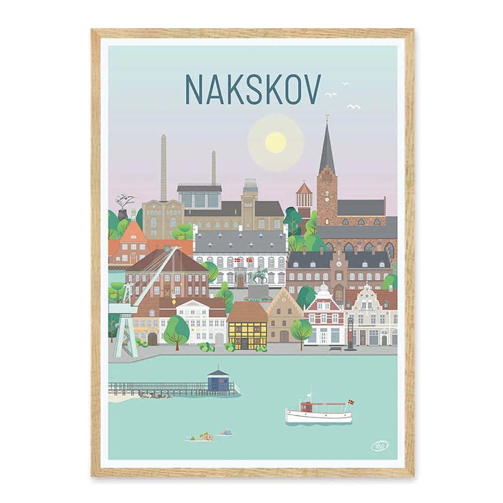 En flot og detaljeret byplakat udarbejdet af Vilakula med motiv af flotte Nakskov. På plakaten finder du blandet andet Nakskov kirke med Nakskov Fjord foran og Nakskov Skibs- og Søfartsmuseum. Vilakula har fanget byens stemning samt flere af byens flotte bygningsværker. Den smukke Nakskov plakat er designet i et farverigt univers der vil pynte smukt på væggene i ethvert hjem, og skaber en kontrast til de sort/hvide hjem.