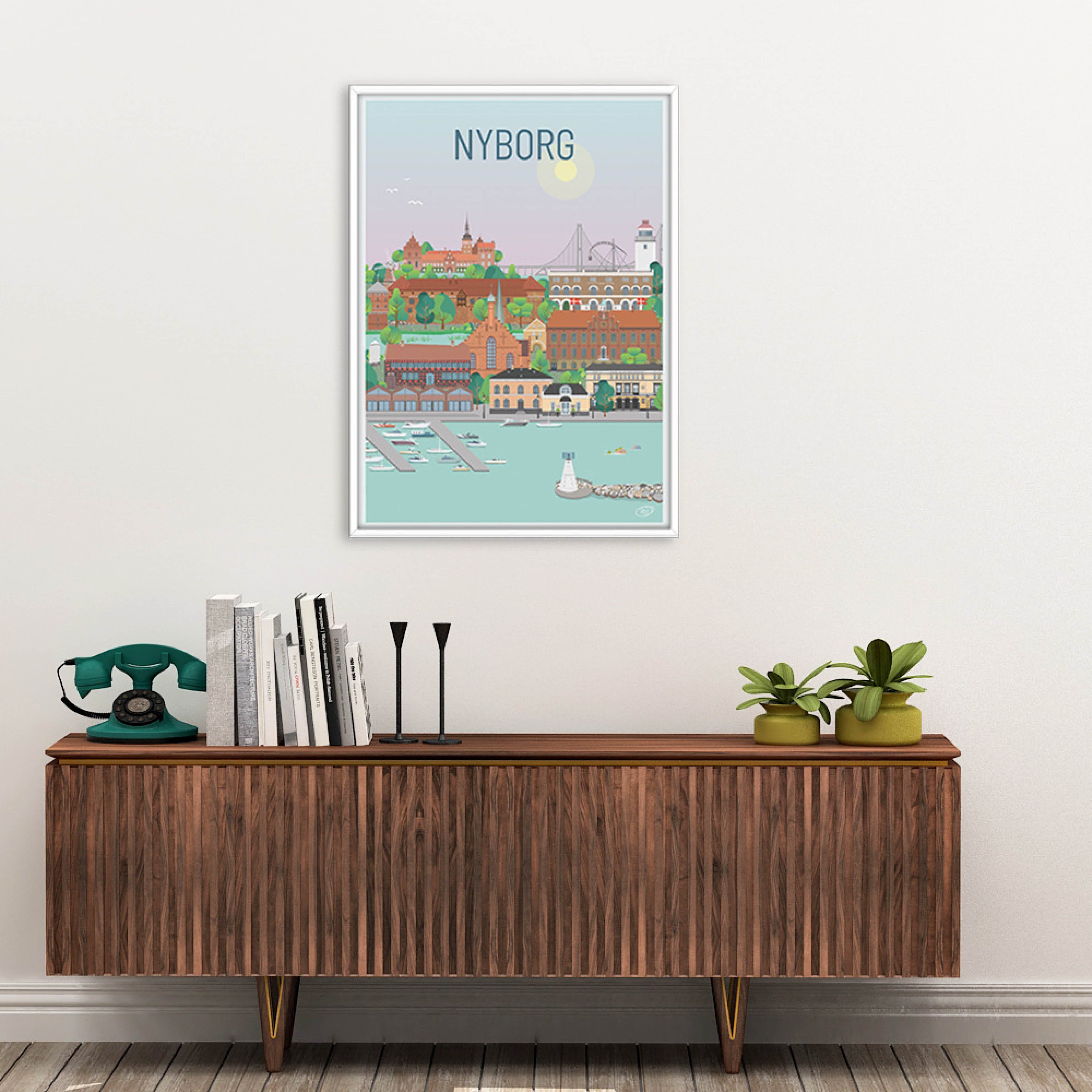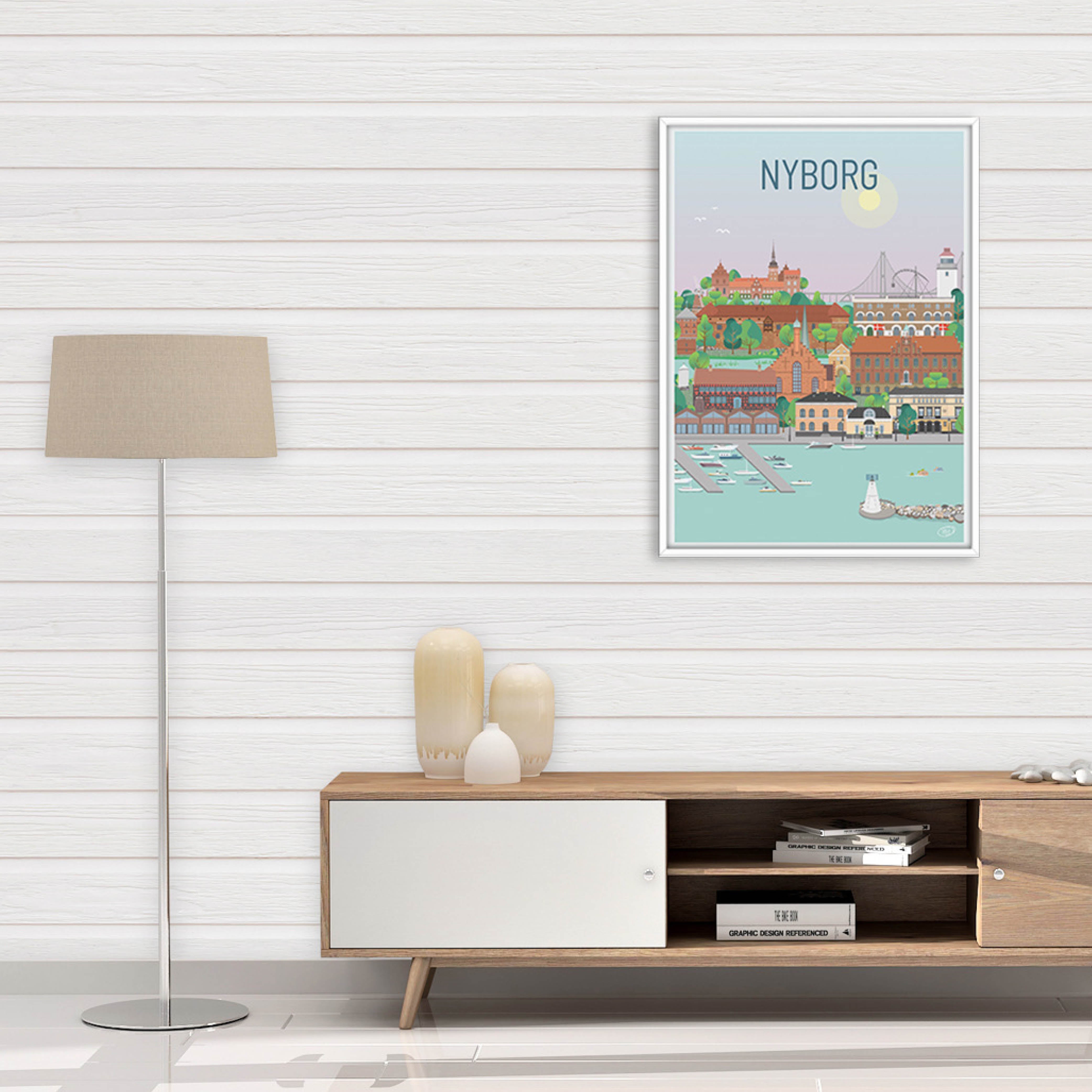 En smuk og detaljeret byplakat udarbejdet af Vilakula med motiv af skønne Nyborg. Her har de fanget byens stemning samt flere af byens flotte bygningsværker. Den smukke Nyborg plakat er designet i et farverigt univers der vil pynte smukt på væggene i ethvert hjem, og skaber en kontrast til de sort/hvide hjem.
