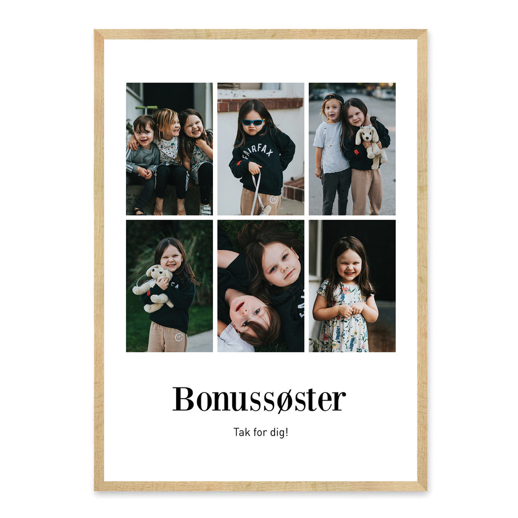 En bonussøster bringer nye farver, grin og oplevelser ind i livet. Hun skaber minder, der langsomt bliver til dyrebare øjeblikke, og bliver en vigtig del af familien på sin egen måde. Denne plakat hylder det særlige bånd, der opstår mellem jer, og kan designes med 6 eller 9 billeder, en personlig titel og tekst, så den afspejler jeres historie.