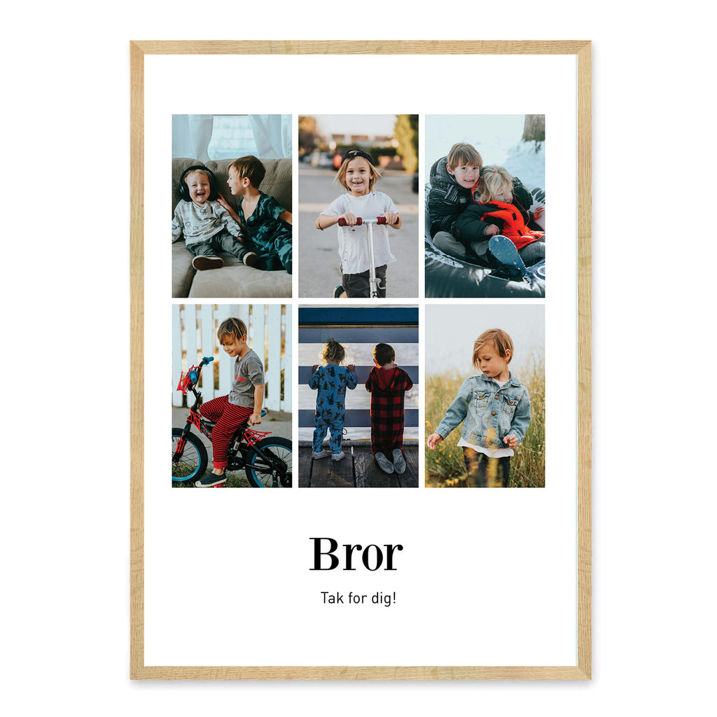 En bror er ofte både legekammerat, støtte og fortrolig. Han er en del af minderne, de sjove øjeblikke og de små hverdagsglæder, der gør familielivet helt særligt. Denne plakat hylder det tætte bånd mellem jer og kan designes med 6 eller 9 billeder, en personlig titel og tekst, så den afspejler jeres historie på en unik måde.