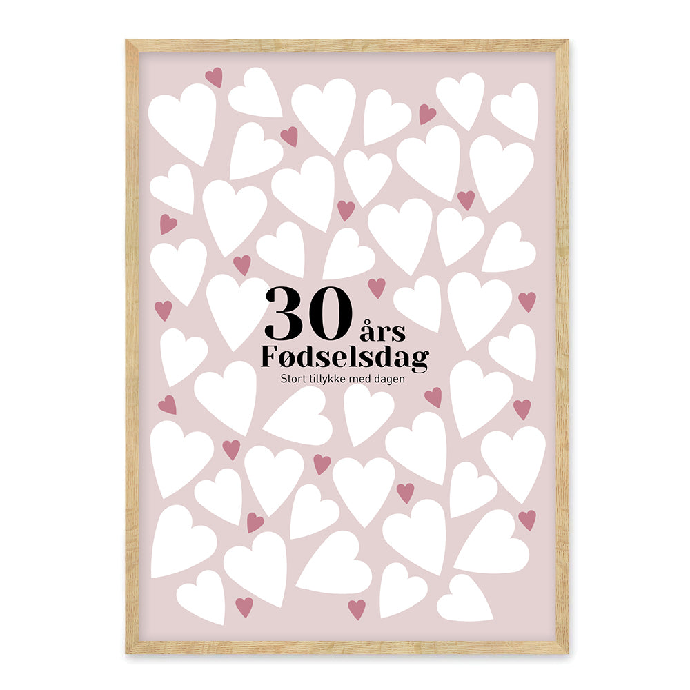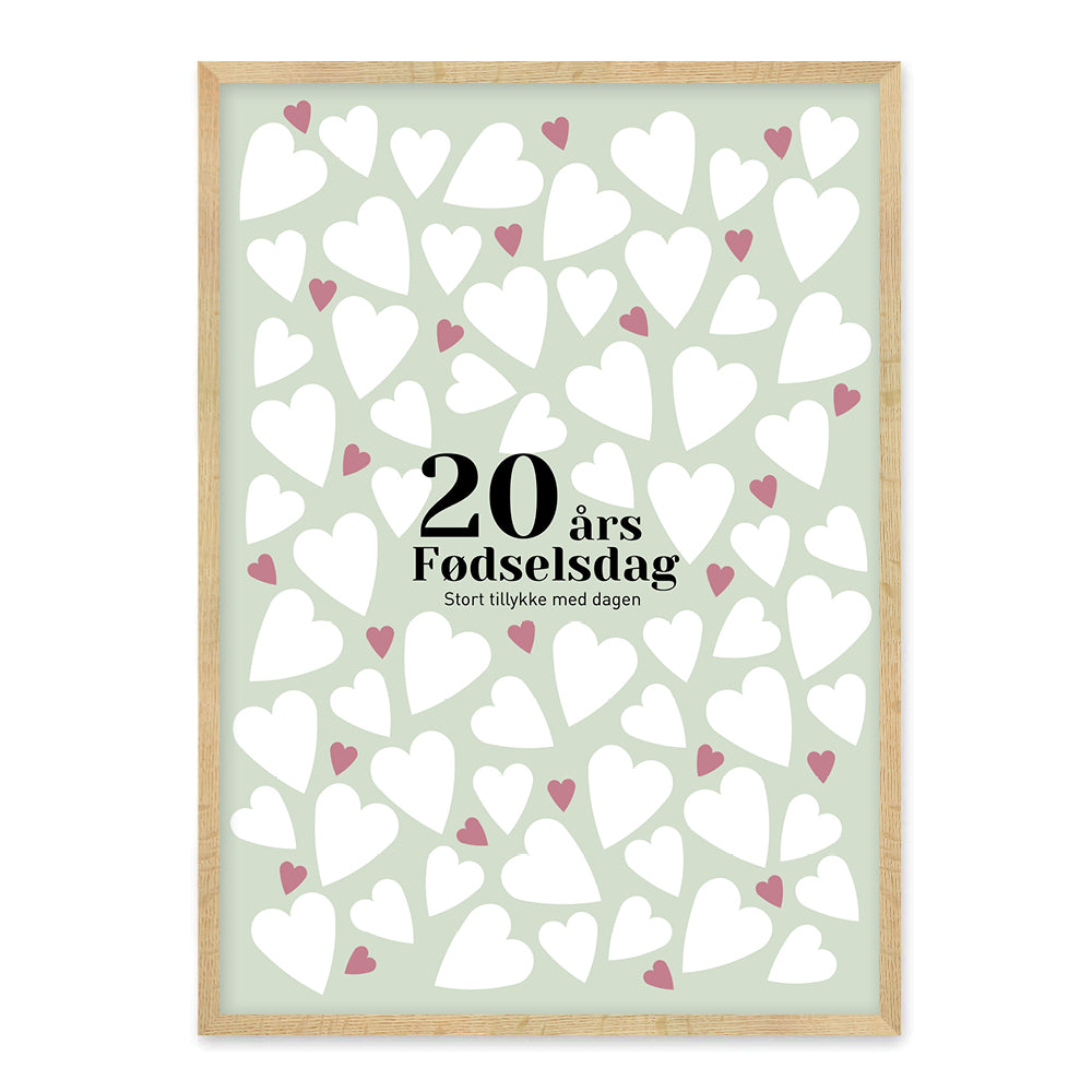 Et 20 års fødselsdag er en vigtig milepæl, der markerer overgangen til voksenlivet. Denne gæsteplakat med hjerter giver venner og familie mulighed for at skrive små hilsner, der samler minderne fra festen. Du kan selv vælge farver, antal hjerter og tilføje en personlig hilsen, så plakaten bliver helt unik. En oplagt gave, der vil pynte og minde fødselaren om dagen mange år frem.