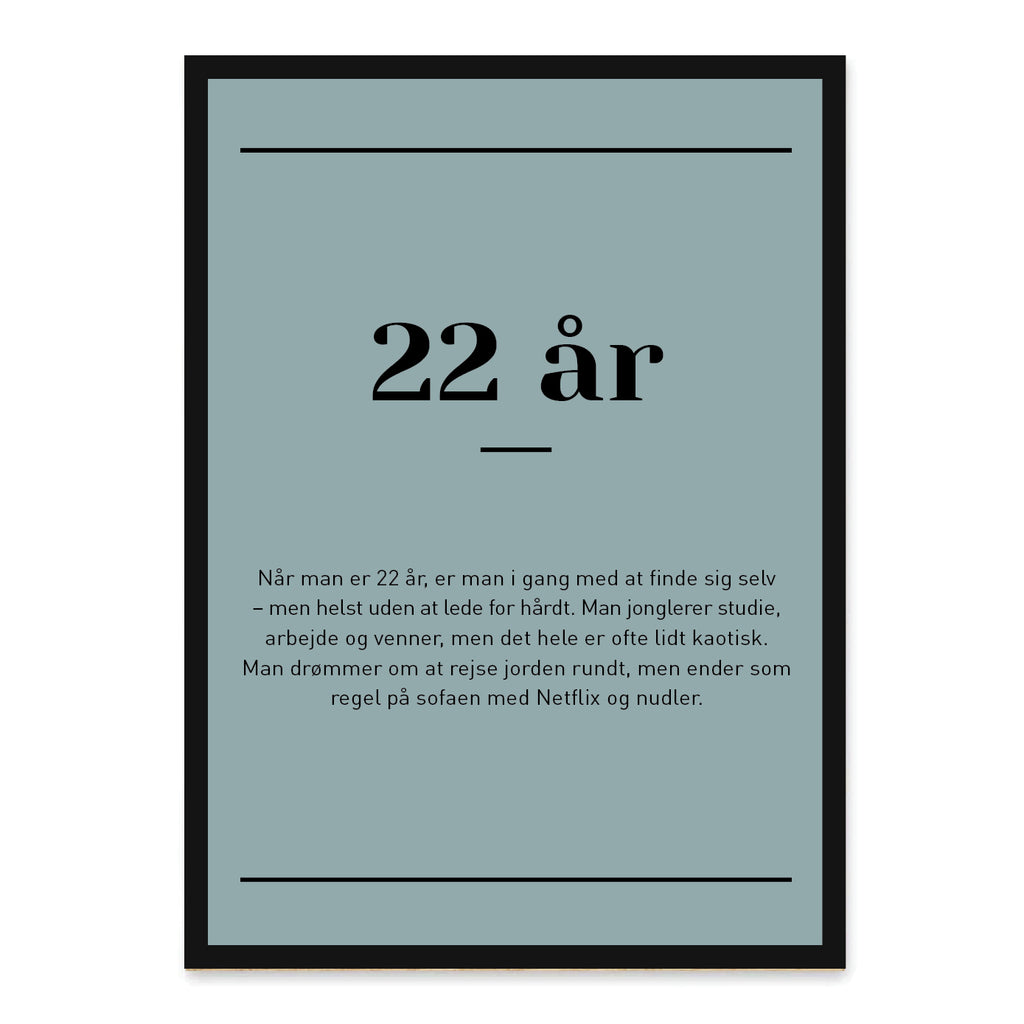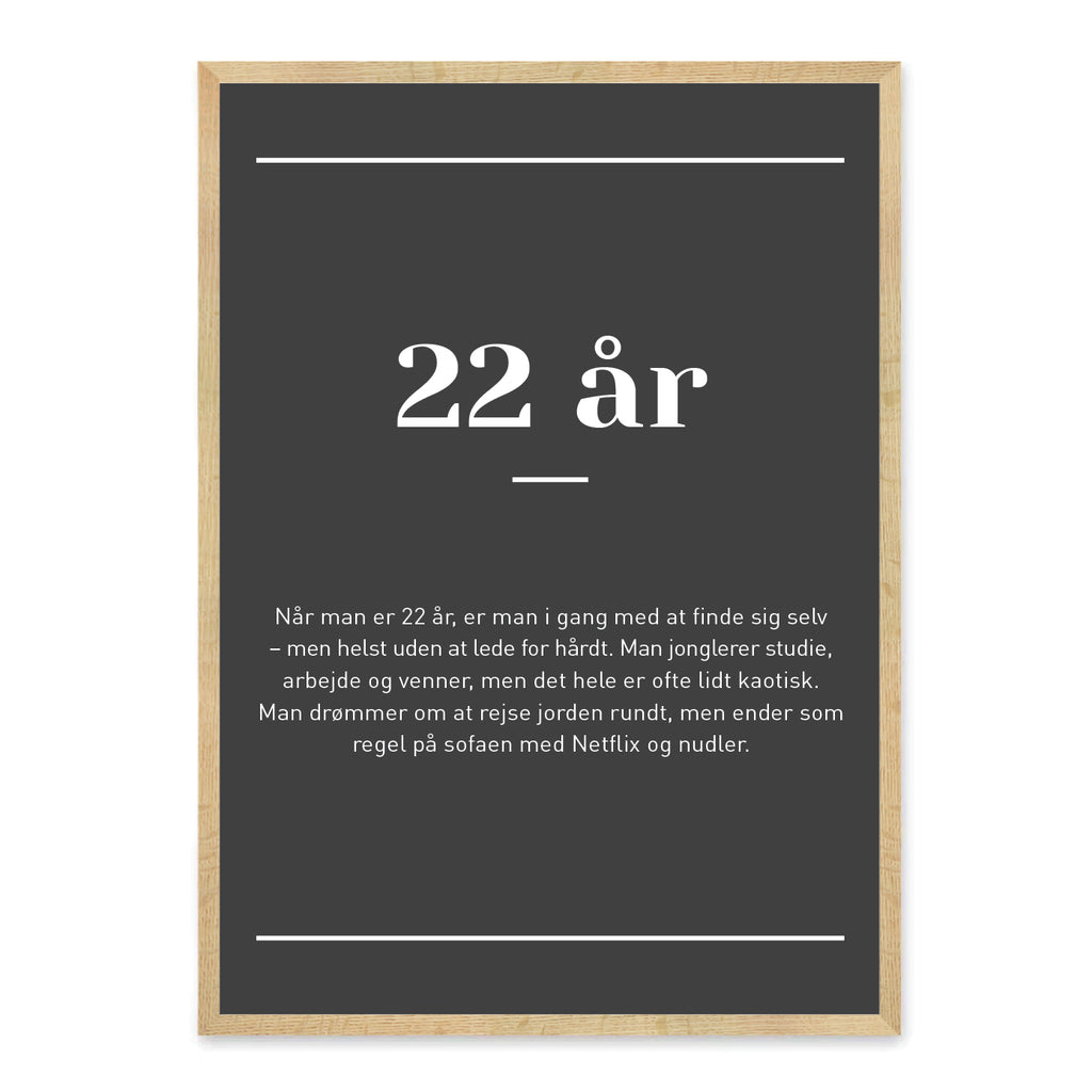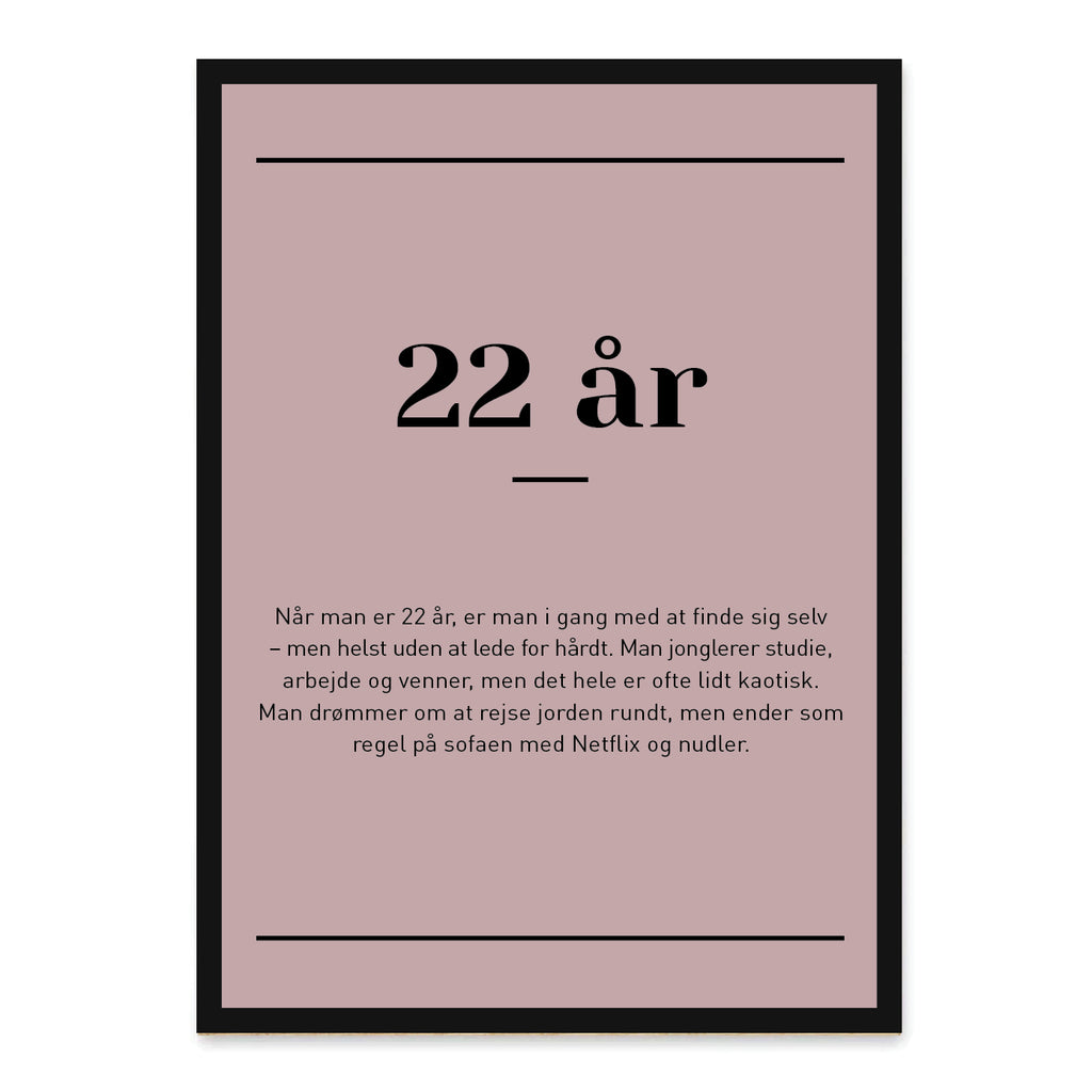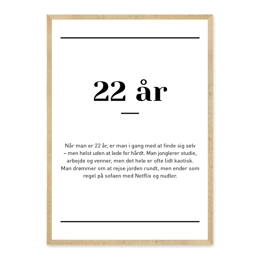 22 år – en alder hvor man teknisk set er voksen, men stadig googler, hvordan man koger ris. Denne plakat giver en sjov og kærlig beskrivelse af livet som 22-årig – hvor man jonglerer mellem frihed, ansvar og stadig prøver at finde sin plads i verden (og måske sin cykelnøgle).
