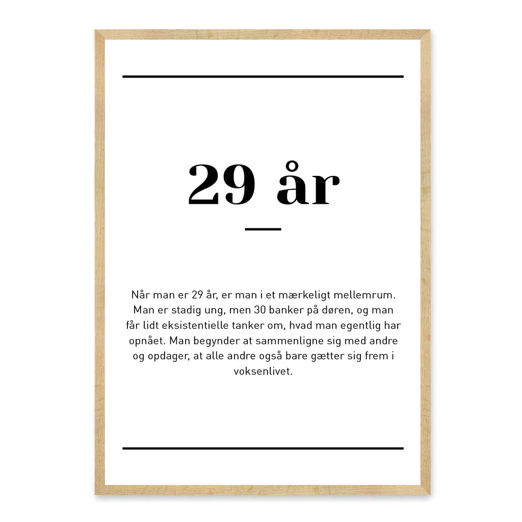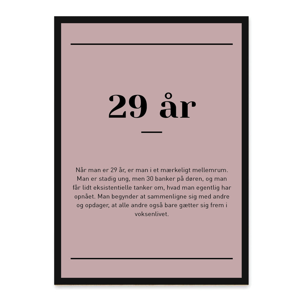 29 år – alderen lige før de store 30, hvor man balancerer mellem ungdommens frihed og voksenlivets ansvar. Denne plakat fanger med humor og varme det særlige ved at være 29 år – fuld af drømme, refleksioner og et glimt i øjet over livets små og store udfordringer.