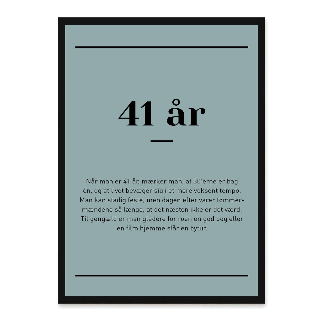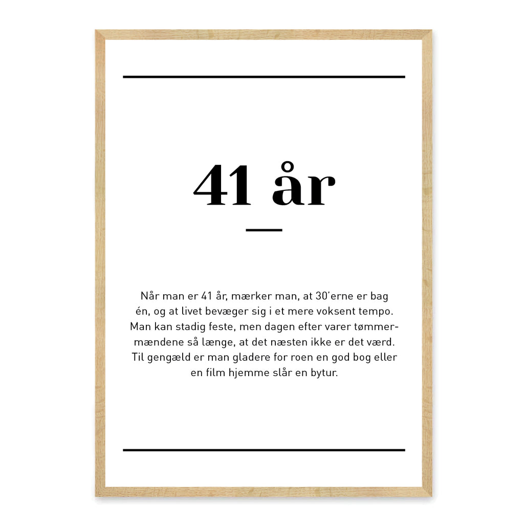 En sjov og personlig gave til 41-års fødselsdagen. Det enkle og moderne design gør plakaten til en dekorativ tilføjelse i hjemmet, som både vækker grin og genkendelse hos alle, der kigger forbi.