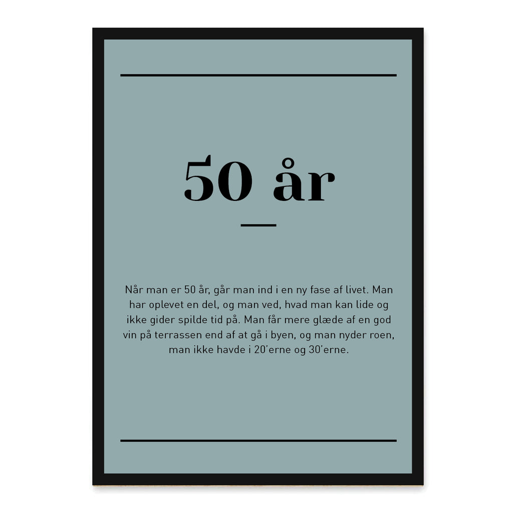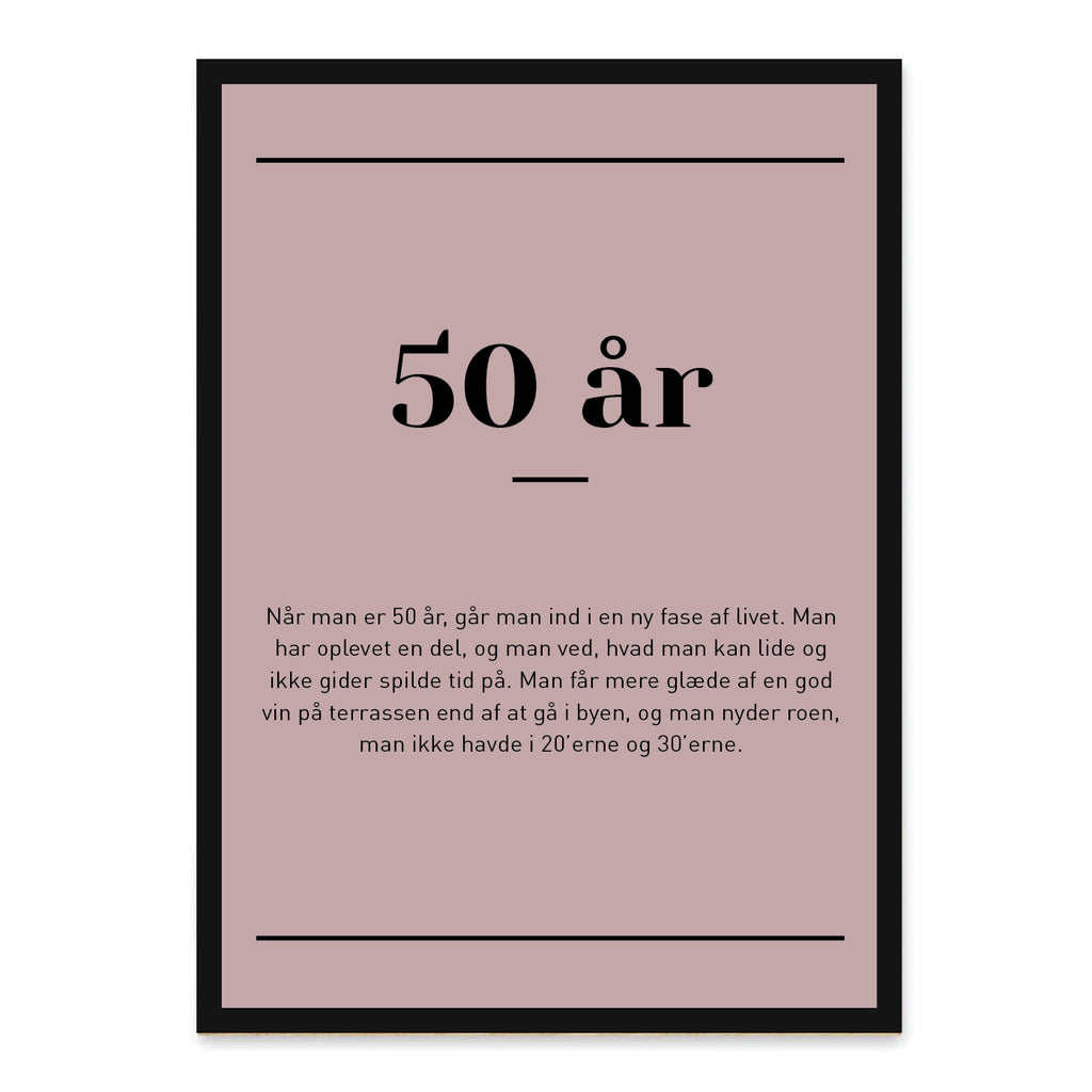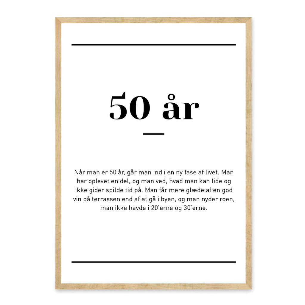 50 år – en milepæl, hvor livserfaring og humor mødes i perfekt balance. Denne plakat fanger med varme og sjov det unikke ved at runde 50 – en alder, hvor man har lært at værdsætte både fortidens minder og fremtidens muligheder.