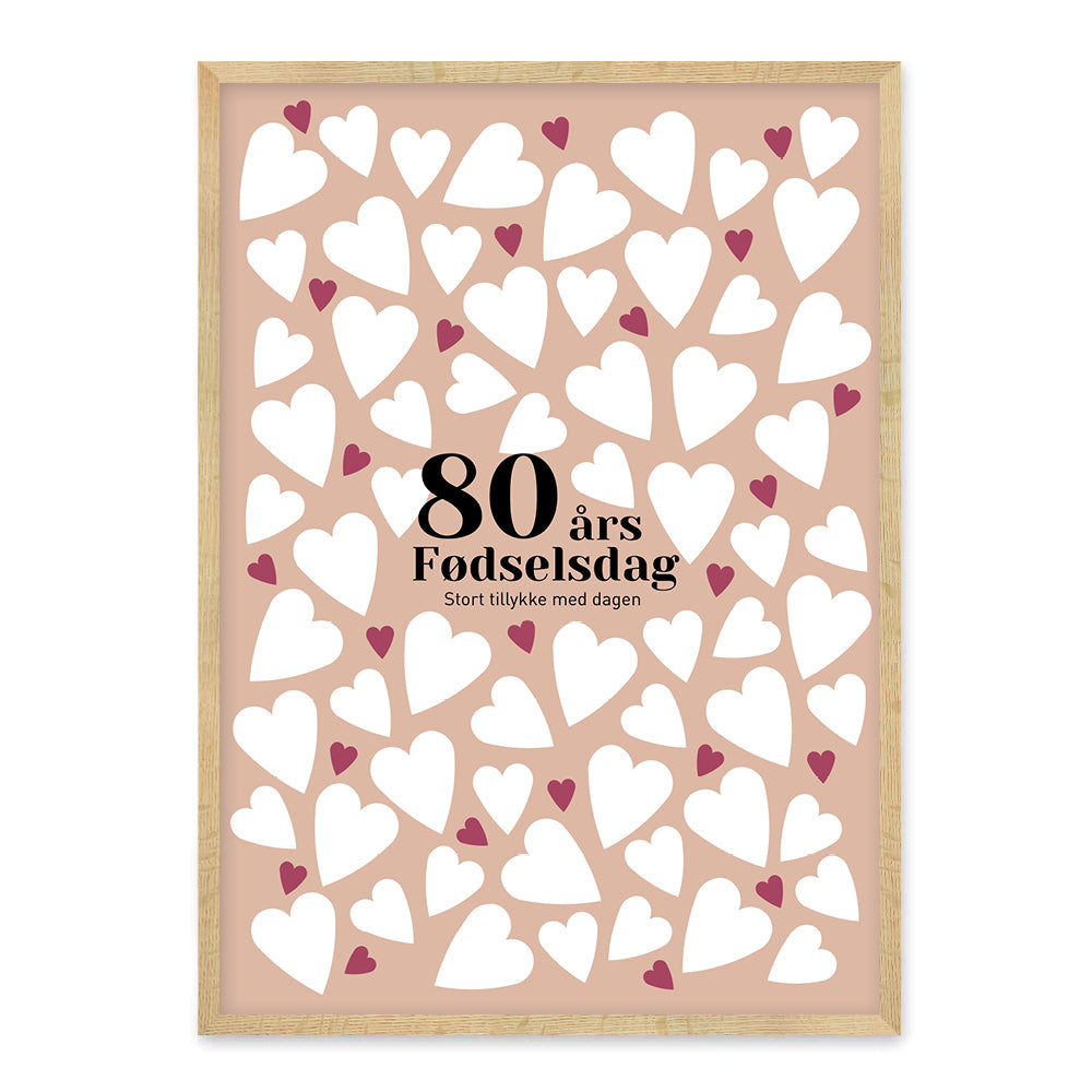 En 80 års fødselsdag er en sjælden begivenhed, som fortjener en gave ud over det sædvanlige. Med denne gæsteplakat kan du samle personlige hilsner fra familie og venner, som fylder hjerterne med minder og kærlige ord. Plakaten kan tilpasses i farver og antal hjerter, og der kan tilføjes en personlig tekst. En gave, der bliver et smukt symbol på livets lange rejse.