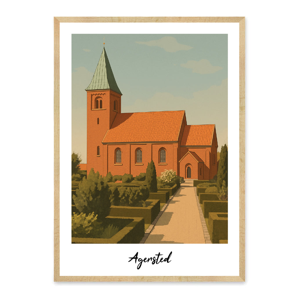 Denne smukke plakat af Agersted Kirke viser den karakteristiske røde teglstensbygning omgivet af en velholdt, grøn kirkegård. Det varme lys, de klare linjer og de flotte farver skaber et harmonisk motiv, der passer perfekt til nordisk indretning. En ideel plakat til dig, der har tilknytning til Agersted, eller som ønsker dansk kirkearkitektur og lokalhistorie som del af hjemmets vægkunst.