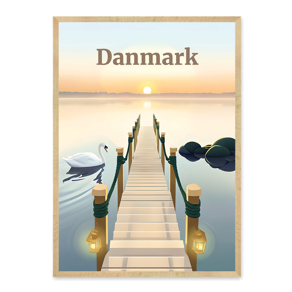 Nyd det fredelige øjeblik ved vandkanten med denne smukke plakat, der viser en lang badebro, der strækker sig ud over roligt vand. En elegant svane svømmer tæt ved broen, mens enkelte sten ligger langs bredden. Solnedgangen kaster varme, gyldne farver over scenen og skaber en stemning af ro og harmoni.