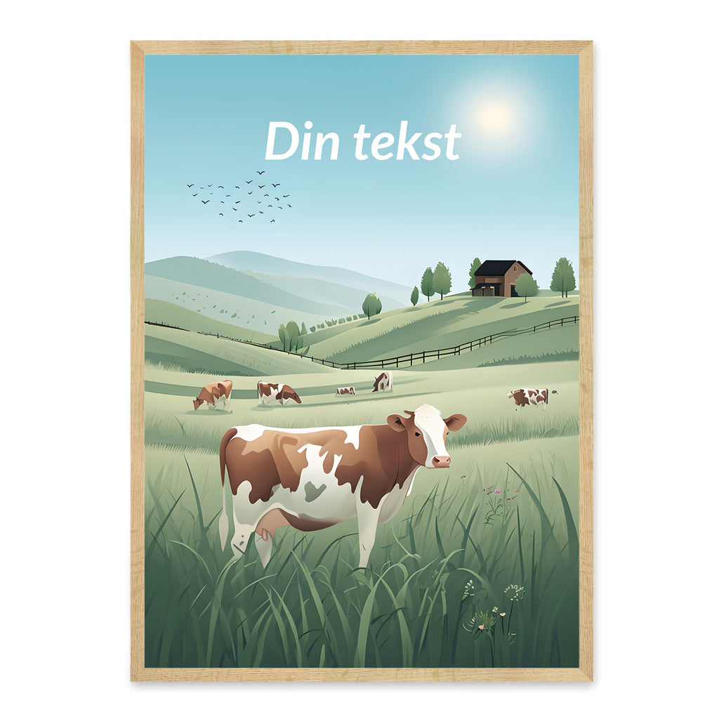 Bring landlig idyl og ro ind i dit hjem med denne smukke plakat af køer, der græsser på marken. Her kan du sætte dit helt eget præg på designet – vælg tekst, farver og skrifttype, så plakaten passer perfekt til din stil og indretning.