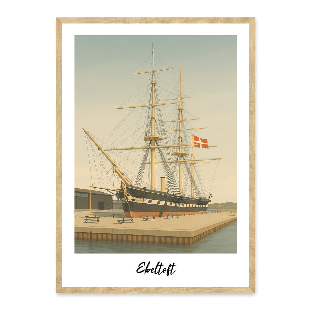 Denne flotte plakat hylder et af Danmarks mest imponerende historiske skibe – Fregatten Jylland, som ligger majestætisk ved havnen i Ebeltoft. Motivet fanger fregattens karakteristiske master, detaljerede rig og den ikoniske galionsfigur, alt badet i et blødt og varmt lys, der fremhæver skibets stolte silhuet. Vandet og havnemiljøet omkring skibet giver plakaten en autentisk maritim stemning, mens det danske flag blafrer smukt i vinden og fuldender udtrykket.