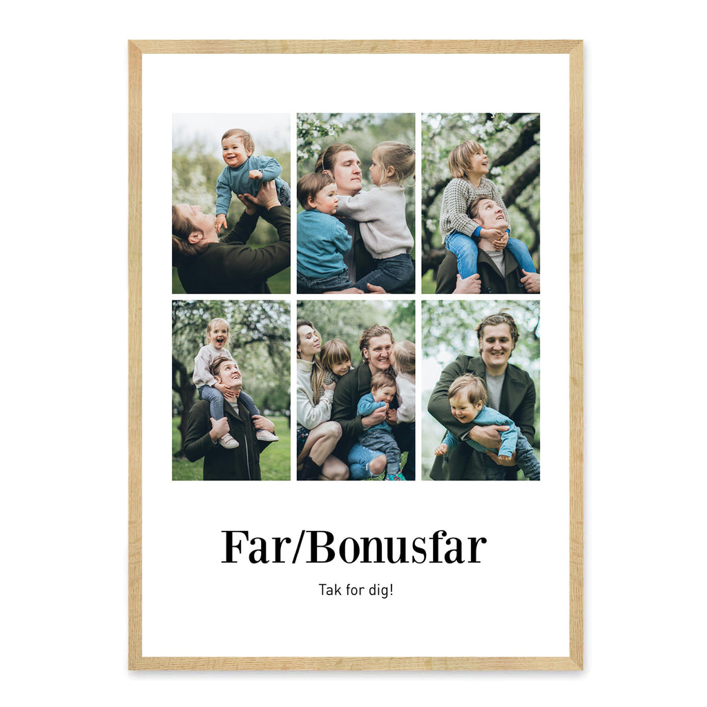 Forkæl jeres far/bonusfar med en personlig plakat, der hylder hans omsorg, styrke og de særlige øjeblikke, I deler. Plakaten kan tilpasses med dine egne 6 eller 9 billeder, en personlig overskrift og tekst, som fortæller hans helt unikke historie og de minder, der gør jeres bånd særligt.
