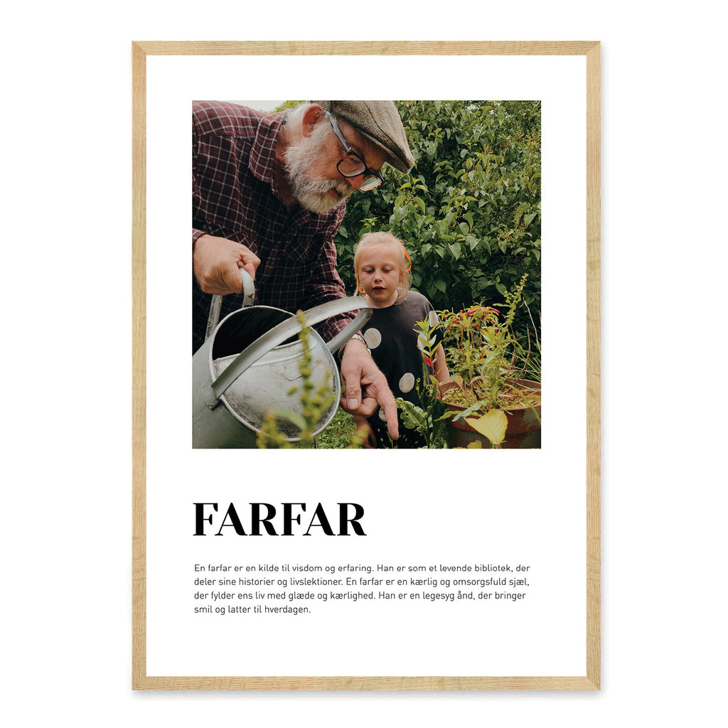 Gør plakaten personlig ved at vælge en færdig tekst eller skrive din egen, og upload ét eller flere billeder, der fortæller jeres historie. En oplagt gaveidé til fødselsdag, jul eller som en varm overraskelse, der hylder farfars unikke plads i familien. Det stilrene, nordiske design gør plakaten til et tidløst minde, der kan pryde ethvert hjem og bringe smil i mange år frem.