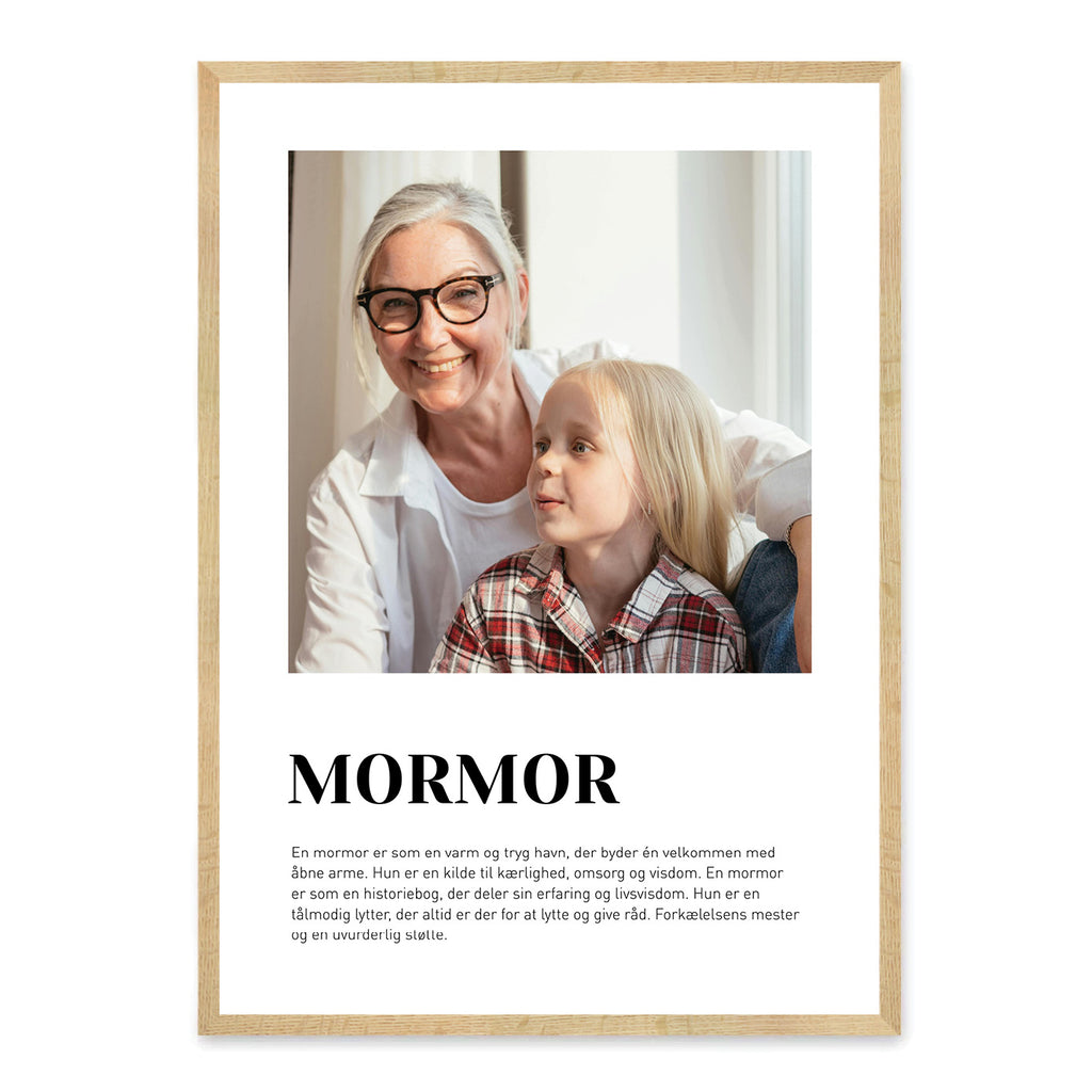 En Mormor-plakat er en kærlig måde at hylde den helt særlige relation, du har til din mormor – uanset om I har delt barndommens minder eller først har knyttet bånd senere i livet. Den indfanger de grin, kærlige øjeblikke og små stunder, der gør jeres forhold unikt. Plakaten er en smuk måde at vise, hvor meget hun betyder for dig, og hvilken vigtig rolle hun spiller i dit liv.