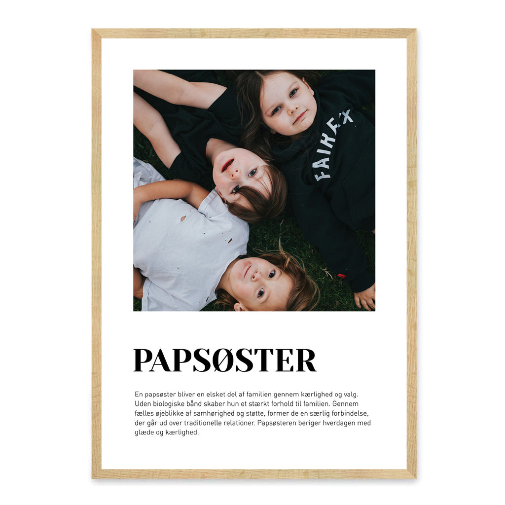 En Papsøster-plakat er en kærlig måde at hylde den helt særlige relation, du har til din papsøster – uanset om I har kendt hinanden i mange år eller først er blevet en del af hinandens liv senere. Den fremhæver de minder, grin og små øjeblikke af nærhed, der binder jer sammen som familie, og viser, hvor meget hun betyder, og hvor stor en rolle hun spiller i dit liv.
