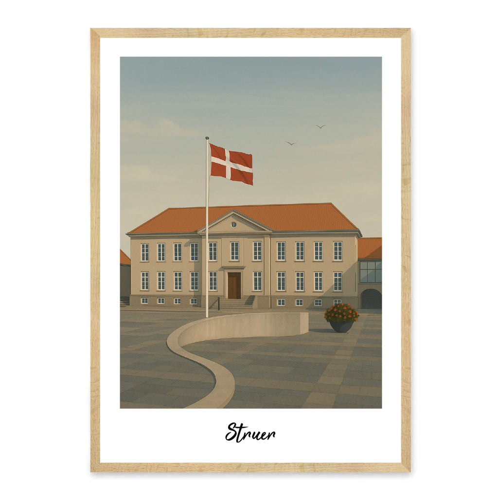 Denne elegante plakat viser Struer Rådhus, et smukt og historisk vartegn i byen Struer. Motivet, som ses i filen, viser rådhusets klassiske facade med symmetriske vinduer, rødt tegltag og et roligt, åbent rådhusplads-miljø foran bygningen. Det danske flag vajer i vinden, og de bløde farvetoner skaber en harmonisk og stemningsfuld atmosfære, der fremhæver byens kulturarv.