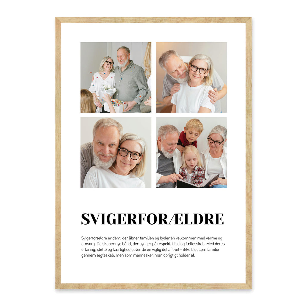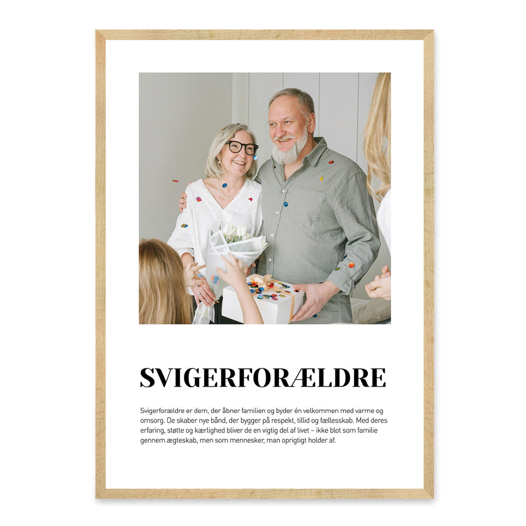 En Svigerforældre-plakat er en smuk måde at vise kærlighed og taknemmelighed til både svigerfar og svigermor. Den symboliserer varme, nærvær og det særlige bånd, der opstår, når familier smelter sammen.